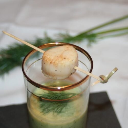 - Schep de soep in een mooi glaasje. Prik de coquille aan een prikkertje en laat het prikkertje boven de soep op de rand bungelen. Garneer de amuse van courgettesoep eventueel met nog een blaadje munt of wat dille.