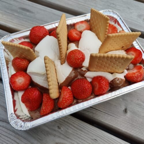 - Verdeel de marshmallows over de aluminium bakjes en leg de chocolade ertussen. Bak 3-4 min. op de barbecue, met de deksel gesloten, tot de marshmallows lichtbruin kleuren en zacht worden. Verdeel de aardbeien over de marshmallows en steek de biscuits erin. Pas wel op: de bakjes zijn heet.