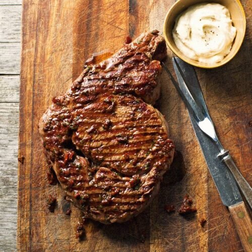 - Keer de côte de boeuf na 2 minuten weer om en bestrijk ook de zojuist gegrilde kant met gepofte knoflookolie. Gril nu beide kanten van het vlees nog een minuutje, tot het vlees een kerntemperatuur van 52 graden heeft bereikt.