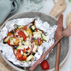 - Zet de pakketjes op een barbecue van ongeveer 200 graden, voor circa 20 minuten. Vouw de pakketjes open en verkruimel de feta erover.