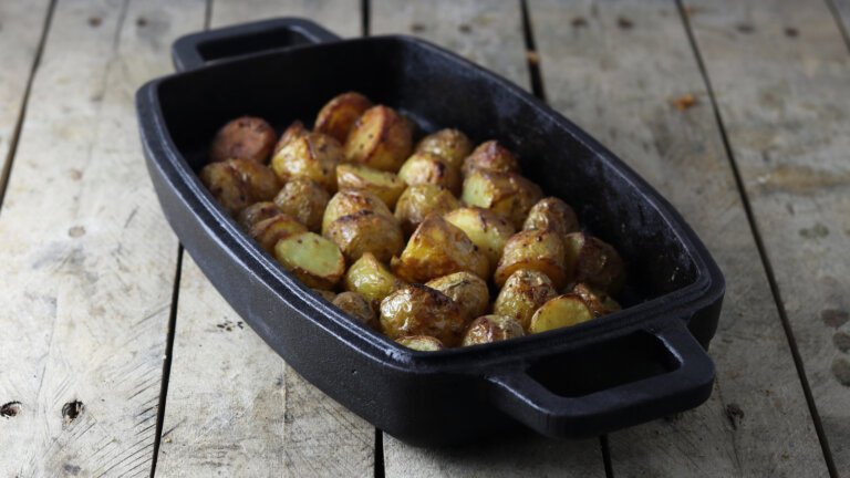 - Haal de skillet nu weer van de barbecue. Laat de aardappeltjes nu 5 minuten rusten en serveer daarna direct.