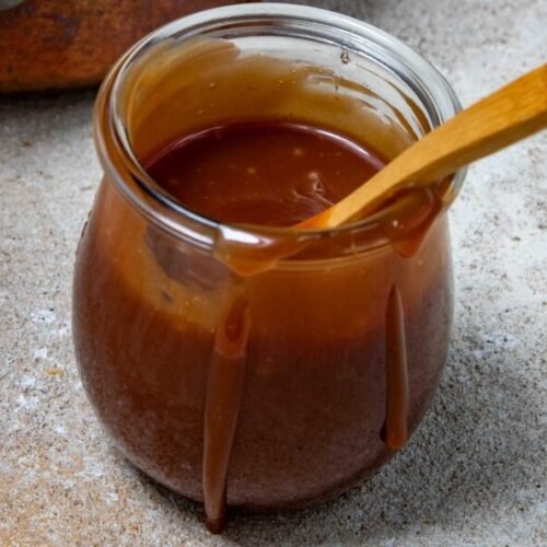 Tijdens het afkoelen wordt de karamelsaus dikker. Zeker als je de saus uit de koelkast haalt is het handig om deze iets op te warmen, zodat de karamelsaus mooi schenkbaar wordt.