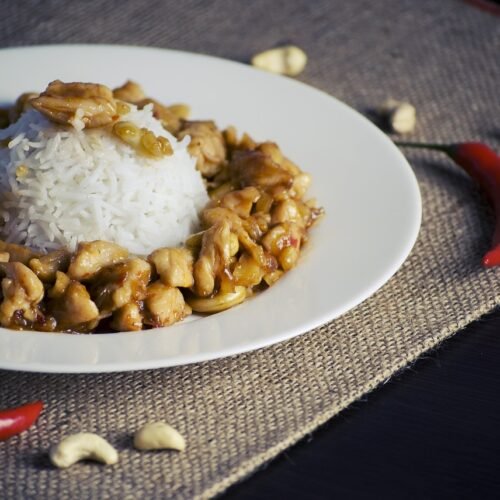 - Giet de olie in de wokpan en bak de knoflook goudbruin. Voeg eerst de uien en de cashewnoten toe. Bak deze even en voeg als laatste de kip toe.