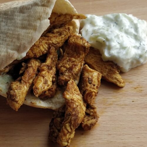 Kip met shoarmakruiden op een pita broodje met een frisse tzatziki salade