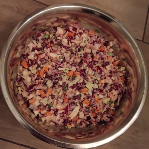 - Voeg hierna de zelfgemaakte honing-mosterddressing toe. Als je de dressing pas op het laatste moment toevoegt, blijft de koolsalade lekker knapperig.