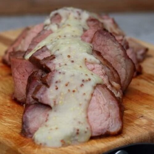 - Snijd de rosbief nu in dunne plakken en serveer de mosterdsaus eroverheen of in een kommetje ernaast.