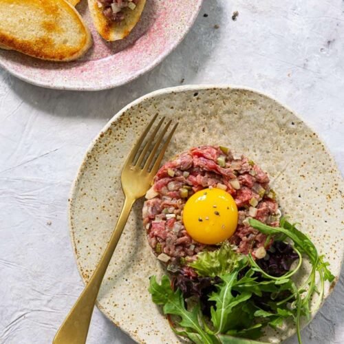 - Serveer de steak tartaar met op elke steak tartaar een eidooier met wat peper en zout.